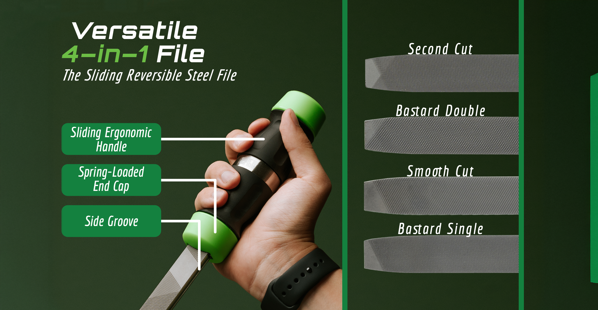 Designed for precision and ease, the SlidaFile™ features a non-slip rubber grip, a sliding ergonomic handle, and a spring-loaded end cap to ensure a secure file lock.